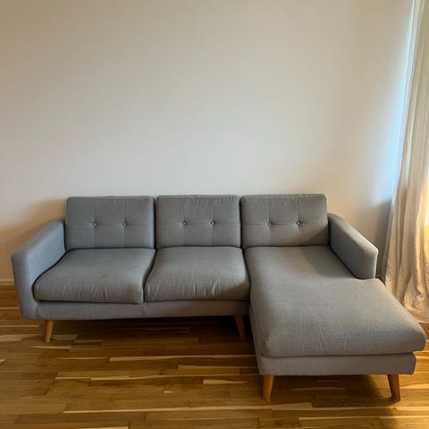 3-personers sofa med chaiselong. Lysegrå betræk med egetræs ben.