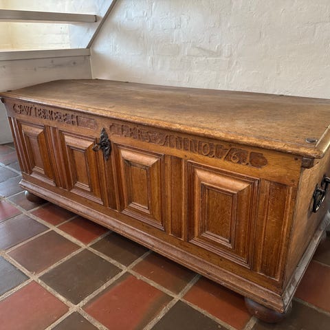 Trækiste i egetræ med dimensionerne 60 cm i længden, 52 cm i højden og 57 cm i bredden. Kisten har en låge med lås og er velegnet til opbevaring.