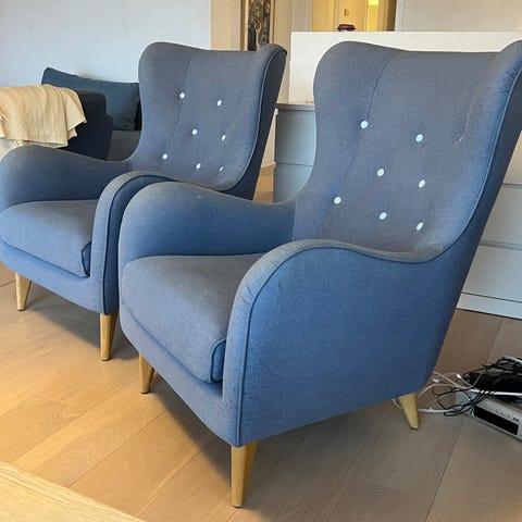 Sæt bestående af to blå lænestole med tilhørende fodskamler. Stolene er betrukket med stof og har træben. Sættet er designet til komfort og afslapning i hjemmet. Pris pr. stk. 500,- begge 2 for 900,-