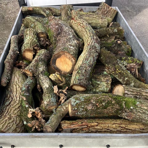 Stort trailerlæs, 3,5T trailer måler 4,25 x 1,8 m. Fældet i jan-feb 2025. Skåret i 28 cm, kan også leveres i andre mål. Eg fældet august 2025, kan også leveres til samme pris.