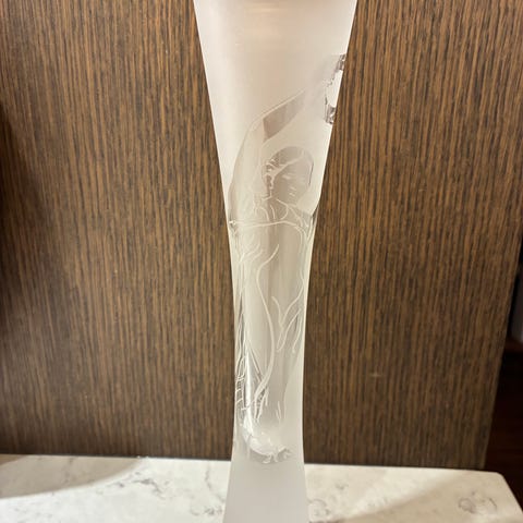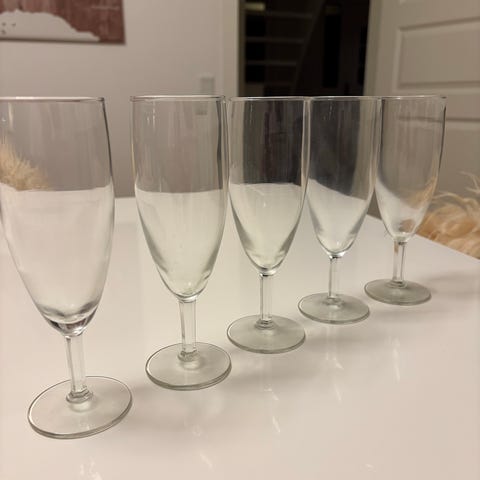 Flotte champagneglas med fin halvmåne/stjerneformet fod. Glassene har forskellige farver og mønstre, som giver et dekorativt udtryk. Egnet til servering af champagne eller mousserende vin.