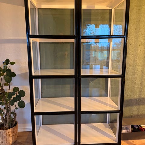 Vi sælger vores vitrineskab i sort jern, da vi har brug for et større. Det fremstår som nyt uden synlige brugsspor og er sat næsten 50 % ned i pris (nypris 6.399 kr.).
