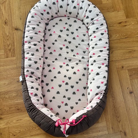 Babynest med blomstret mønster på indersiden og mørk stofkant. Designet til at give en tryg og komfortabel soveplads til babyer. Kan bruges i seng, vugge eller som en flytbar soveplads.