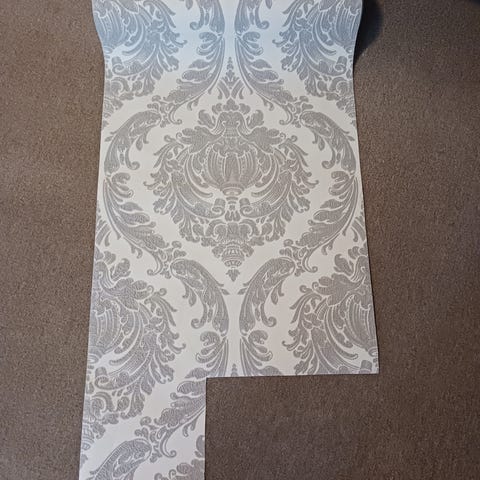 Tapet med et mønster i guld på en lys baggrund. Tapetet er fra Graham & Brown. Ved ikke hvor stor overflade der er til, men syntes der var for meget til at smide det ud. Håber at det kan bruges af en kreativ sjæl