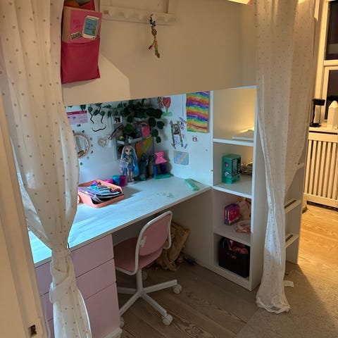 IKEA højseng i hvid, designet til børn. Sengen har integreret opbevaring med hylder og skuffer under sovepladsen, samt en stige til adgang. Materialet er robust og egnet til børneværelser. Madrassen er ryger end standard.