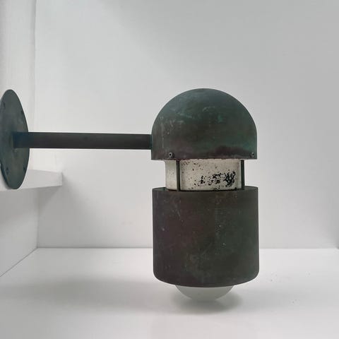 Smukt patineret kobberlampe til udendørs belysning. Tung og virkelig kvalitet. Der skal evt monteres nyt fatning da jeg ikke kender pæretypen der sidder i nu.