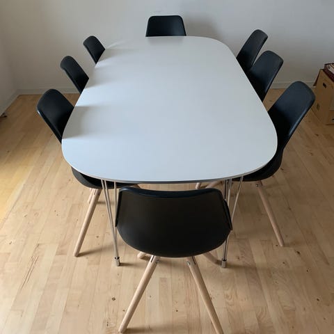 Hvidt højglans spisebord på blankt stålstel. Plads til 4-6 personer.