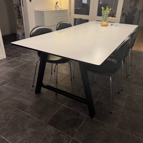 Bred Furniture “Freja” spisebord med bådform og buet ender, hvid laminat, sort kant, 2 stk. tillægsplader, 100 x 200 cm + tillægsplader så bordet kan blive 300 cm, T-ben i børstet stålsatin. Fremstår som nyt - der har ligget en dug på hele tiden .