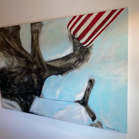 Dette er et moderne, abstrakt maleri, der ser ud til at være malet med akrylmaling på lærred.
