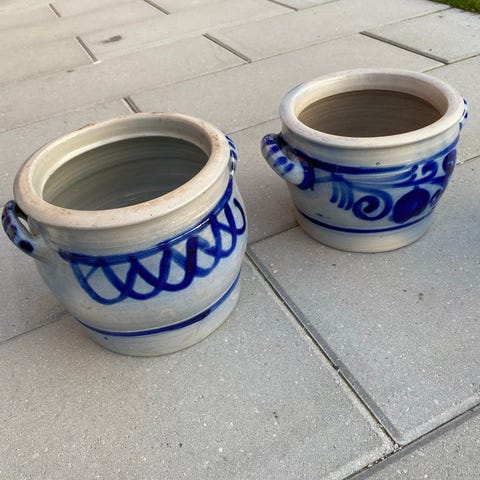 2 lerkrukkertil fedt og 1 til smør, er glasseret fra Denby Stoneware, England , som nye, aldrig været brugt. måler 13, 5 i diameter og højden er 9,5 cm med låg.