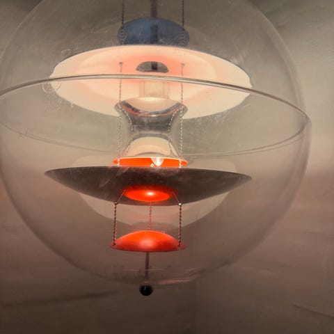 Louis Poulsen Verner Panton PH Globe pendel med karakteristisk globusformet skærm. Lampen har flere indvendige reflektorer i forskellige farver, der bidrager til en jævn og blød belysning. Designet af Verner Panton og produceret af Louis Poulsen, velegnet til ophæng i stuer eller andre rum, hvor dekorativ og funktionel belysning ønskes.