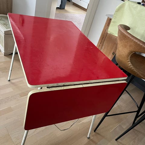 Flot stand, plader kører fint. Ingen rust på stel. Passer godt til en udestue, studieværelse eller til camping. Ben kan skrues af. Udtræksplader er hver 25 cm lange
