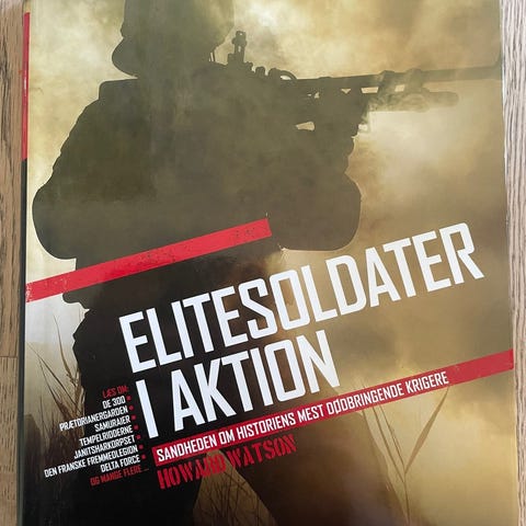 Elitesoldater i aktion, fra år 480 F.KR. til nu, emne: historie og samfund, Bogen på 219 sider er som ny. Den er rigt illustreret. Den begynder med de 300 spartanske krigere og slutter Delta Force. Der er fakta om bla. våben, taktik og teknik