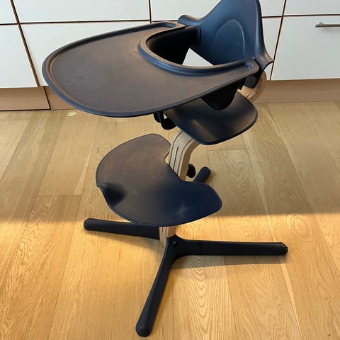 Stokke højstol i blå farve. Designet til børn med justerbart sæde og fodstøtte. Fremstillet i holdbare materialer med aftageligt bakke til nem rengøring. Velegnet til brug ved spisning og aktiviteter for børn.