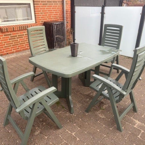 Der er almindelige brugsspor/ridser på stolene, men intet der påvirker funktion eller stabilitet. Bordet skal rengøres og have olie, hvilket vi har gjort hvert år – og herefter fremstår det igen rigtig flot.