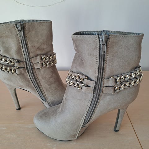 Flotte stilet støvletter med helt intakte stilethæle (uden skrammer). Flot lys natur farve/Kaki. Smart "guld"-flet kæde pynt på skaft. Meget flotte og brugt én gang. Prisen er fast. Se div. foto. KAN OGSÅ SENDES.