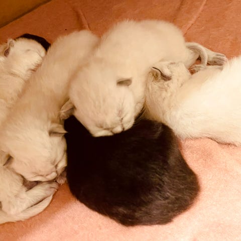 De er allerede begyndt at spise tørfoder og bruge kattebakke. De får kvalitetsfoder fra Orijen six fish og royal canin mother baby pate.