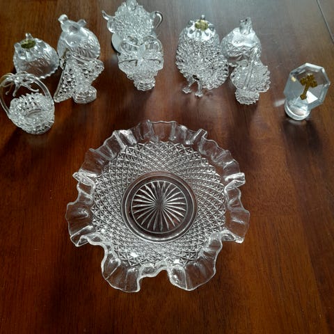 Her er der flere smukke glas og krystal glas fra Prag og Polen sælges billigt. Der er små håndlavede mundblæste glas nips (f.eks. kyssende svaner; et skib,, to vaser, en kurv med en fugle, en påfugle osv....) Se billederne.
