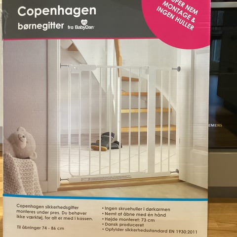 BabyDan Oslo børnegitter med justerbar bredde fra 74 til 84 cm. Designet til at forhindre børn i at komme ind i bestemte områder. Gitteret fastgøres uden brug af skruer og er godkendt efter EN1930:2011 standarden.