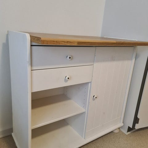 Beba puslebord i træ med flere hylder til opbevaring. Bordet har en overflade med blødt puslemåtte til skiftning af børn. Designet til funktionel brug i børneværelset.