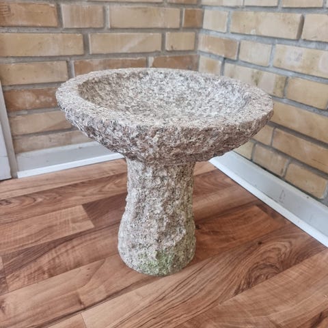Smukt fuglebad i robust grå granit, leveret helt nyt og uåbnet. Det tidløse design og den stabile 2-delte sokkel gør det til et elegant blikfang i haven – og et naturligt samlingspunkt for fuglene året rundt.
