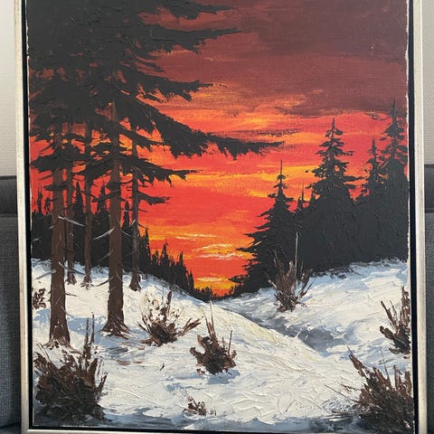 Maleri vinterlandskab med træer og hus