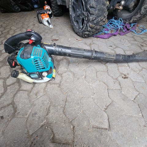 Makita BHX2501 benzindrevet blæser med sort og blå design. Velegnet til udendørs brug til effektiv blæsning af blade og andet haveaffald. Udstyret med håndtag for bedre kontrol under brug.