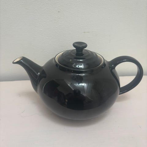 Le Creuset tekande i beige farve, fremstillet i keramik. Tekanden har en rund form med låg og en håndtag til nem håndtering. Velegnet til brygning og servering af te. Nypris 500 kr.