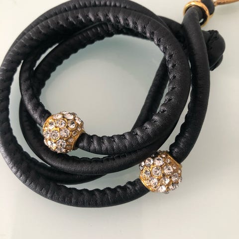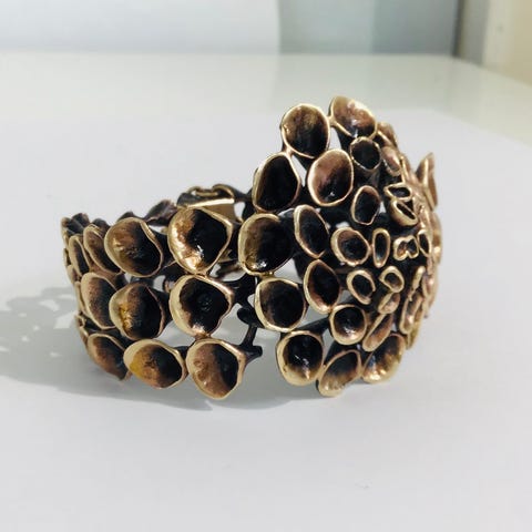 Armbånd med metal og læder. Armbåndet er lavet af Poul Havgaard (Fåborg) for den finske smukkefabrik Laponia. Nye modeller sælges af hans datter, jf. https://poulhavgaard.com/product/bracelet-no-24-bronce/. Nypris lige over 2.000 kr.