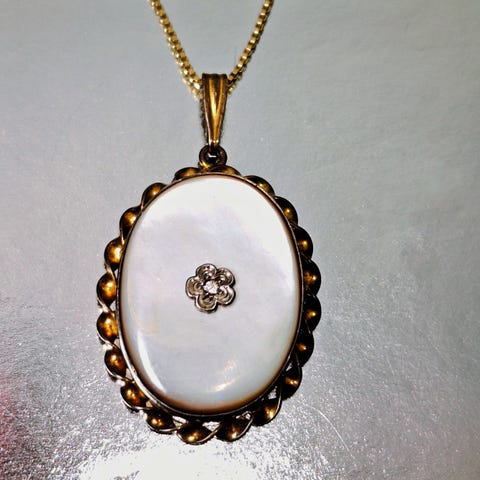 Ægte ramme i sterlingsølv og matchende kæde. Med en lille "rude" som i en medaljon, og plads foroven til at kure noget vigtigt i. Måler 2,2 cm x 1,6 cm på det faste stykke og er stemplet Beau-Ster. Kæden måler 45 cm og er stemplet 925.