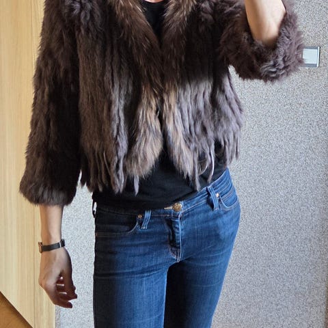 Virkelig lækker lang jakke i kaninpels med detaljer ved ærmer og hals i vaskebjørn. Størrelsessvarende 💜