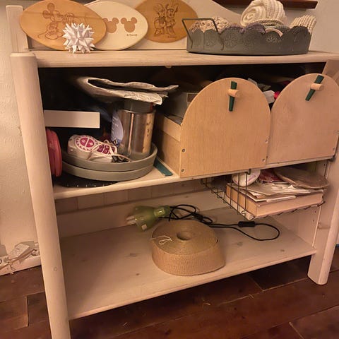 Disney Træreol med fire hylder i naturlig træfarve (let hvidbejset orginal). Reolen kan bruges til opbevaring af forskellige genstande som tøj, tasker, tæpper og småting. Passer til opbevaring i hjemmet til børneværelset