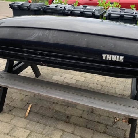 Modula tagboks med tilhørende tagbøjler i sort farve. Tagboksen er designet til montering på bilens tag for ekstra opbevaringsplads. Tagbøjlerne anvendes til fastgørelse af tagboksen på bilen. Den er brugt en gang. Måler 35 x 80 x 195