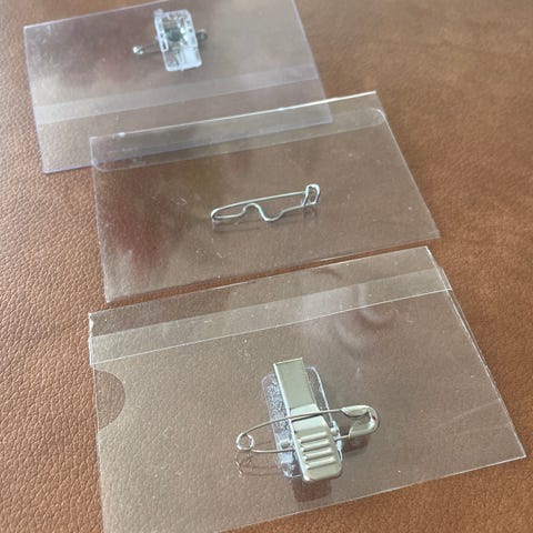 Dengang der var stil over navneskilte. Jeg har set dem dateret til 1930erne, 1940erne og 1950erne, så de har klart været i brug i det lange tidsrum. De fleste har to nåle bagpå, en til at sætte i tøjet og en bredere til at kure et silkebånd på.