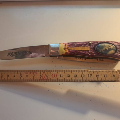 Frontier Double Eagle foldekniv med to blade og læderskede. Kniven har skaft i mørkt materiale med messingbeslag. Egnet til jagt.