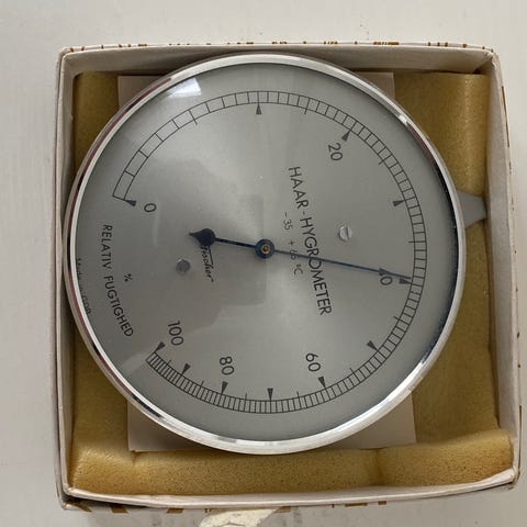 Analogt Fischer HAAR-hygrometer til måling af relativ luftfugtighed. Flot retro vægmodel i messing. Fungerer fint, viser bevæger sig som den skal. Pæn stand med lidt patina (se foto).