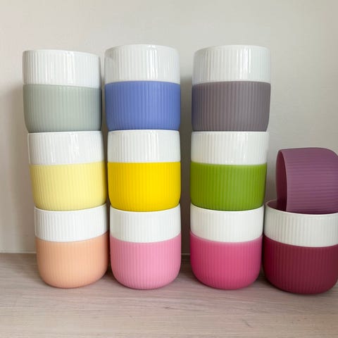Royal Copenhagen gummi holder til riflet krus. Sættet består af to i forskellige farver: gul og lilla.