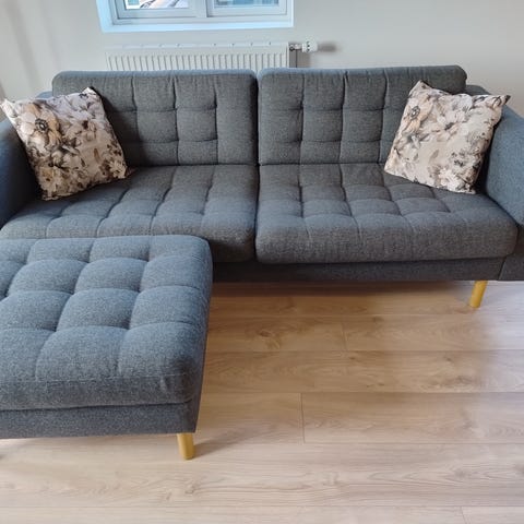 3-personers sofa, 2 lænestole og 1 puf i blå. Kommer fra ikke-ryger hjem og er 4 år gammelt.