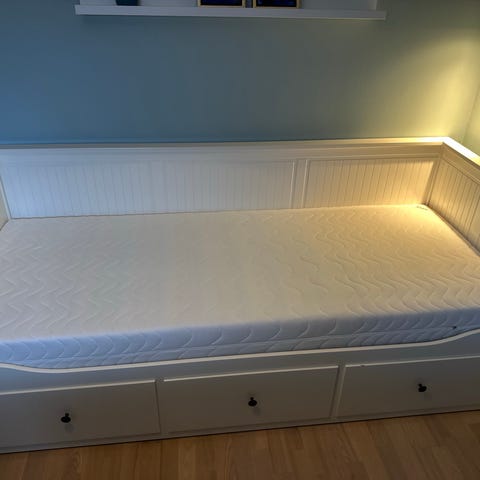 IKEA seng med opbevaring i hvid. Sengen har en ramme med tre skuffer til opbevaring under sovefladen. Sengebunden består af lameller. Sengen kan anvendes som dag- eller soveseng og er velegnet til børneværelse eller gæsteværelse.