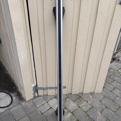 A. Til bil med ræling, hvorpå tagbøjlerne kan hæftes omkring rælingen. Med nøglelås. Se alu-bøjler som er 130 cm lange. Se foto7746-47.