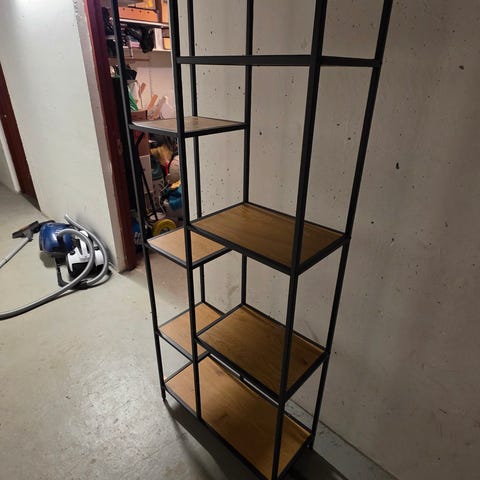 Reol med hvid metalramme og træhylder