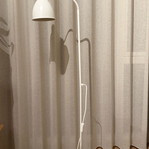 IKEA gulvlampe med hvid lampeskærm og sort fod samt stang. Lampen har en enkel og funktionel konstruktion, velegnet til belysning i forskellige rum.