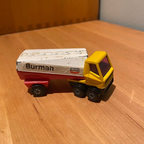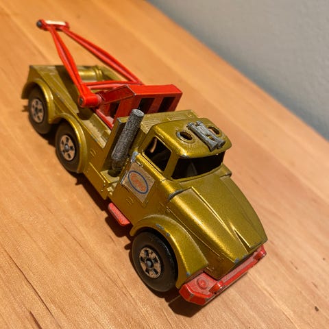 ModelBilen er fra 1971. Den har patina, men intet er defekt. Hjulene ruller stadig fint.