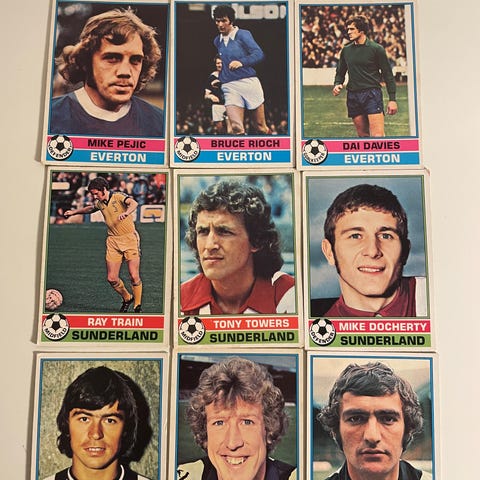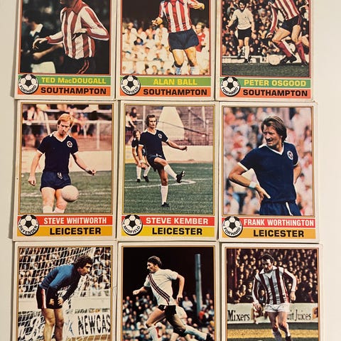 5 stk. gamle fodboldkort med spillere fra Birmingham årgang 1977-78. Kortene er fra Topps og med spilleroplysning på bagsiden.