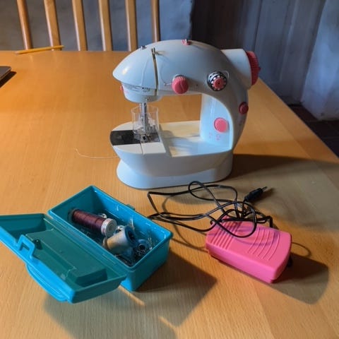 Symaskine med tilbehør og brugsanvisninger, samt sy opskrift.