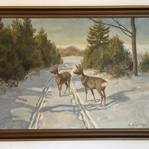 Fint lille olie maleri vinterlandskab med rådyr af Leif Ragn Jensen .