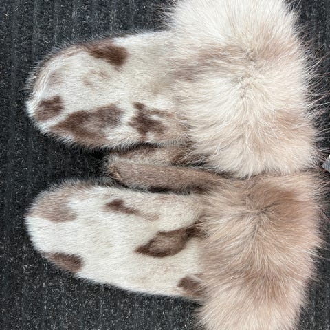 Sølvrævs “manchetter” ved håndleddene. Kalvelæder i håndfladerne. De er foret med varmt og blødt polarfleece.