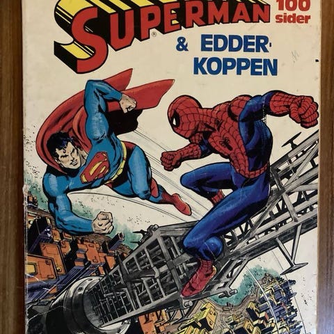 Superman & Edderkoppen tegneserie med 100 sider. Indeholder historier om Superman og Edderkoppen, illustreret i farver. Bogen er på dansk og egnet til samlere og læsere af tegneserier.
