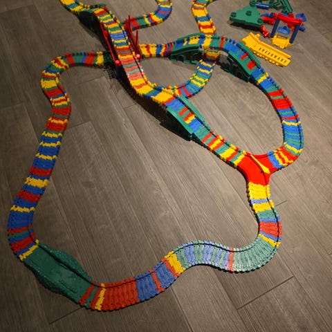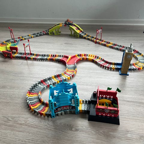 Blandet kasse med Flexi Trax bane. Flere forskellige farver og tilbehør.