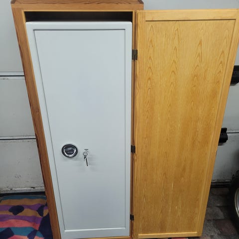 Vevor våbenskab med elektronisk lås og nøgle, sort farve. Skabet er designet til opbevaring af våben og har polstrede indvendige rum til sikker opbevaring. Det indeholder også en separat låsbar boks indvendigt. Materialet er metal, og skabet har en robust konstruktion.